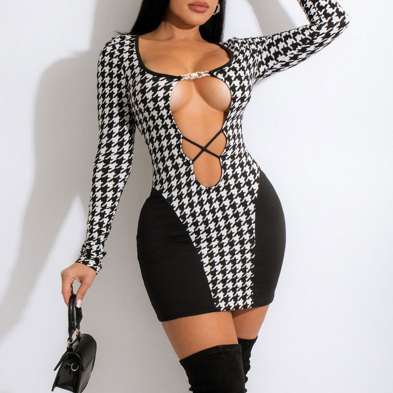 Colorblock Long Sleeve Hollow Out Bodycon Dress