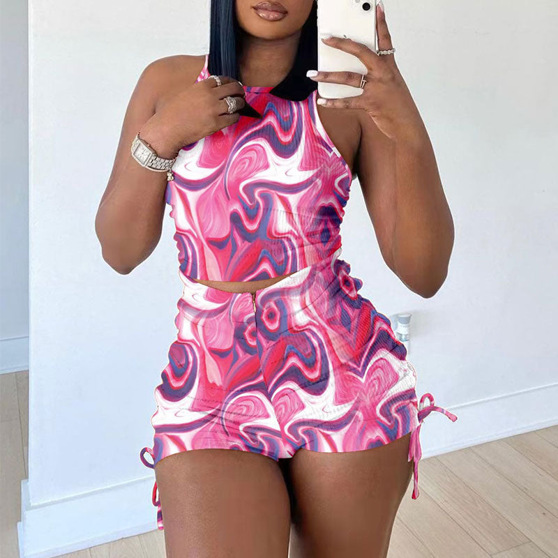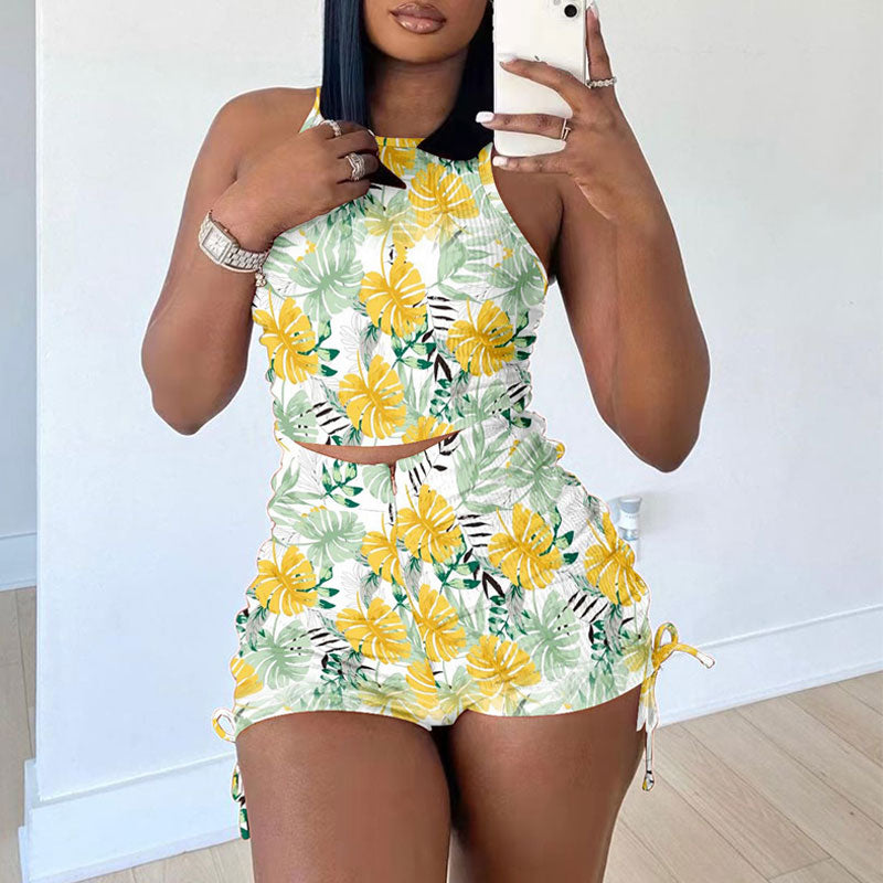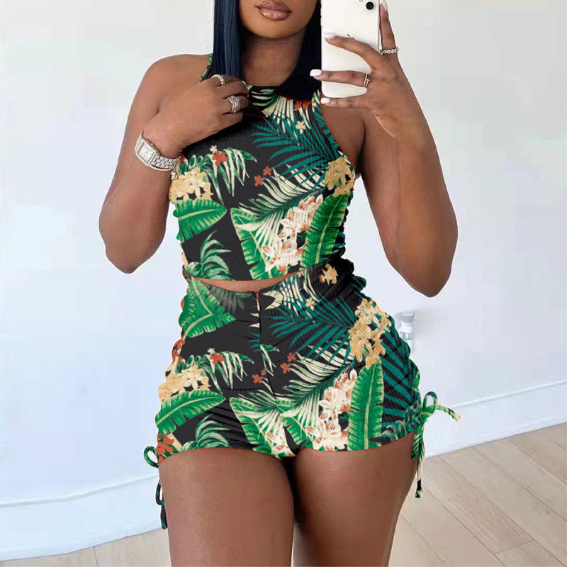 Floral Print Sleeveless Drawstring 2PCS Shorts Set