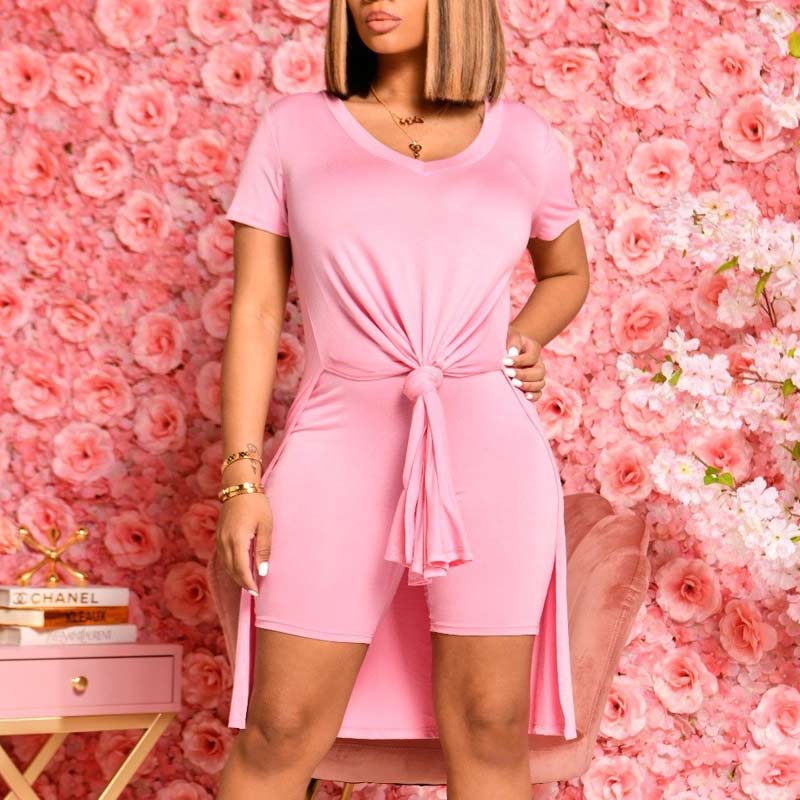 Solid Short Sleeve Slit Two Piece Shorts Set