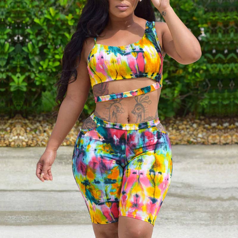 Tie Dye Print Deep Bandage Crop Top & Shorts Set