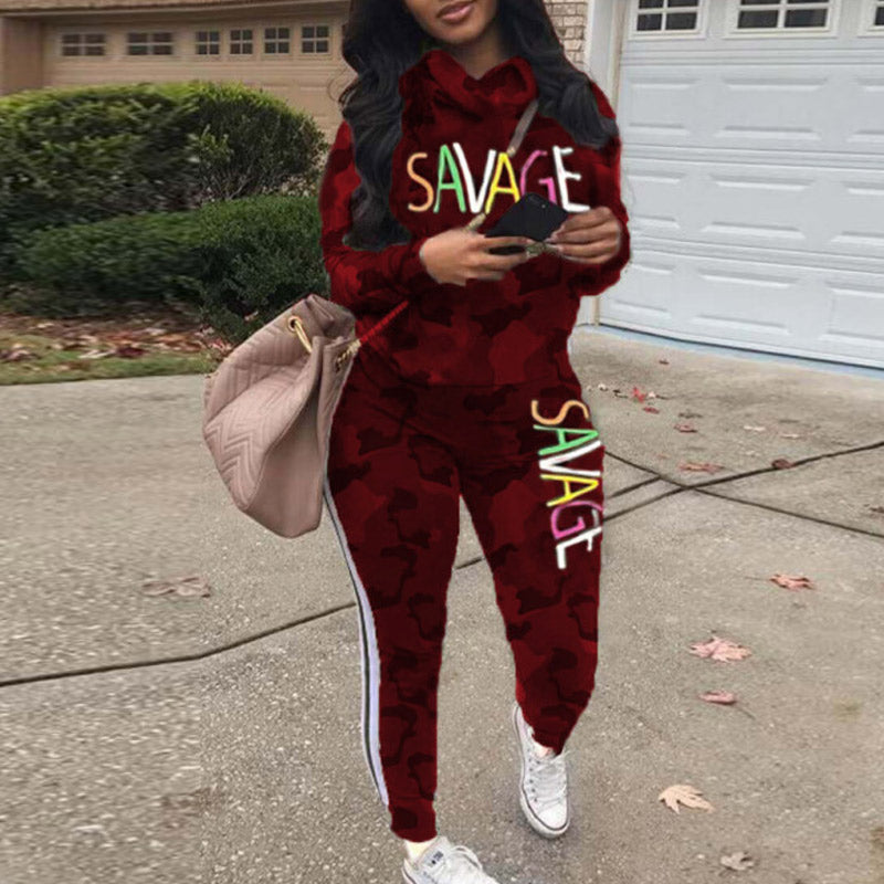 Colorblock Letter Print Long Sleeve Two Piece Set