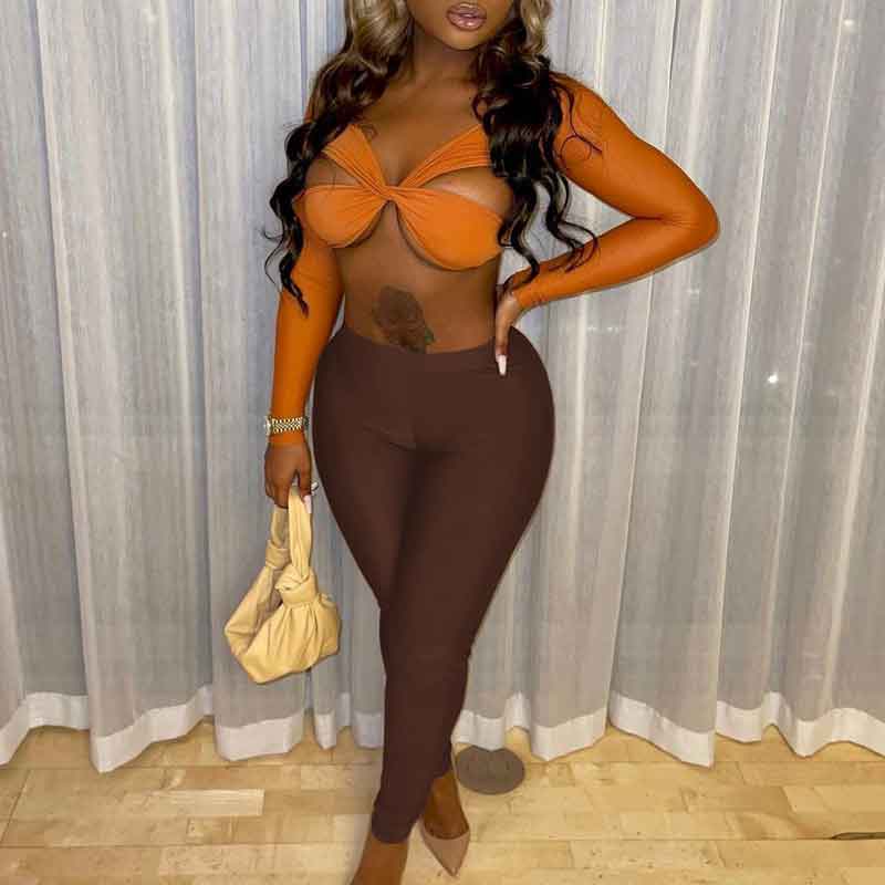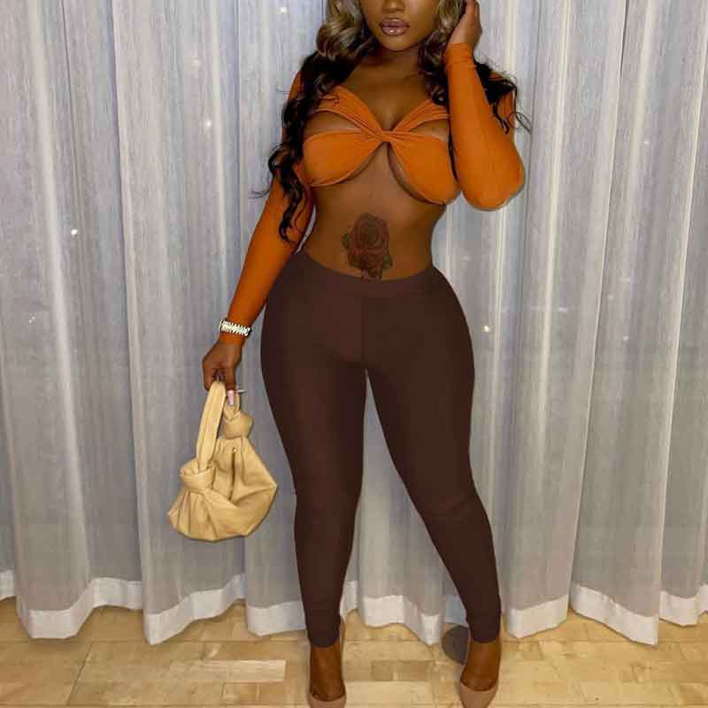 Colorblock Long Sleeve Cut Out Crop Top & Pants Set