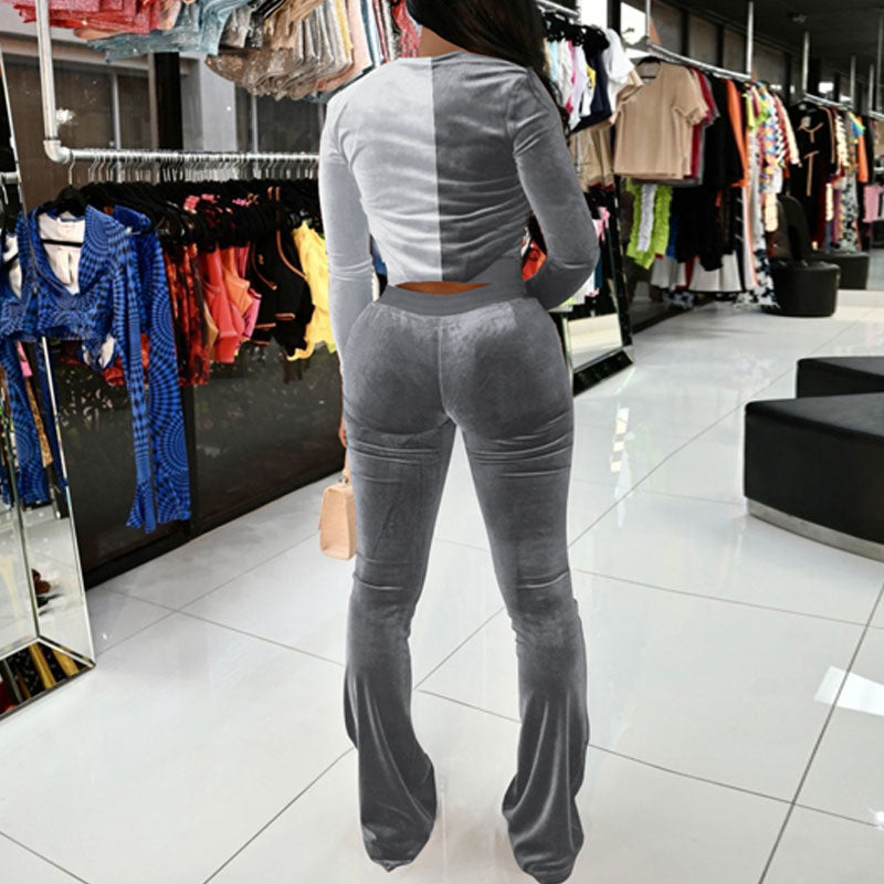 Colorblock Long Sleeve Velvet Lace Up Top & Bell Bottomed Pants Set