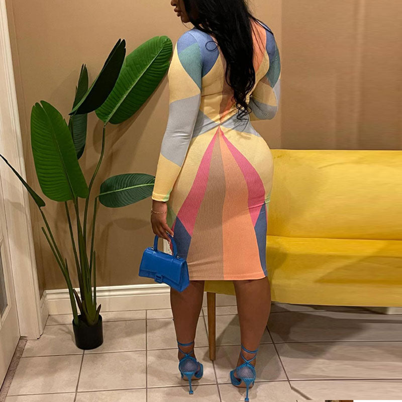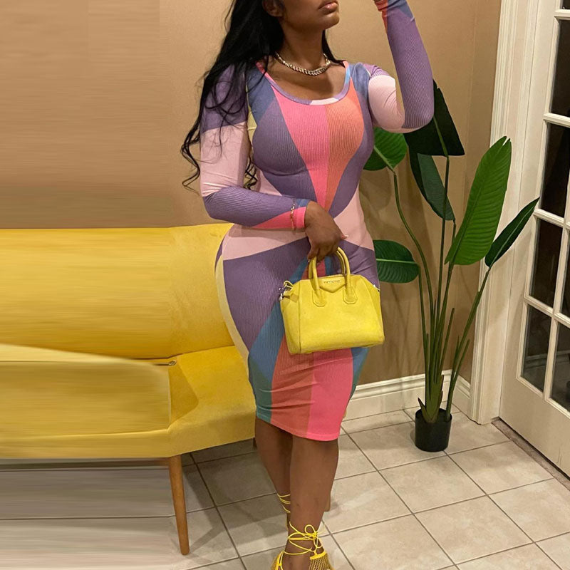 Colorblock Print Long Sleeve Bodycon Dress