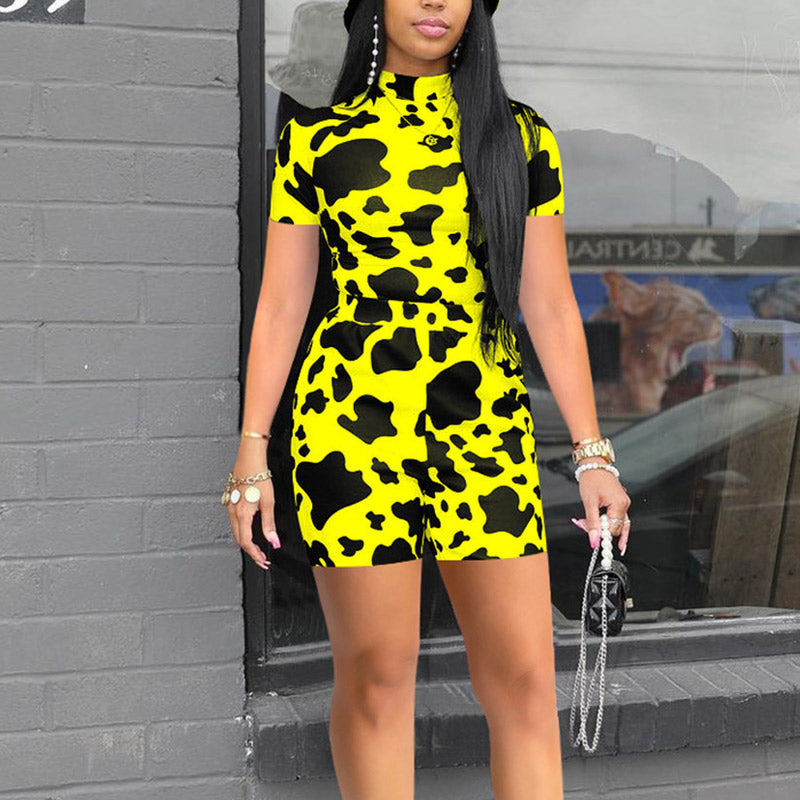 Cow Pattern Turtleneck Short Sleeve Two Piece Set