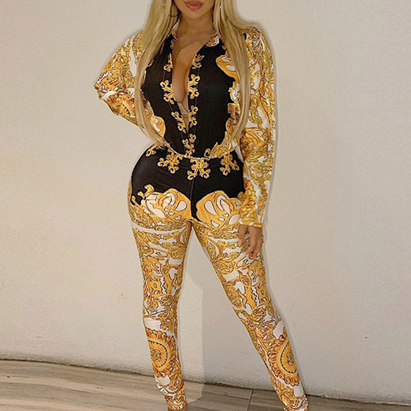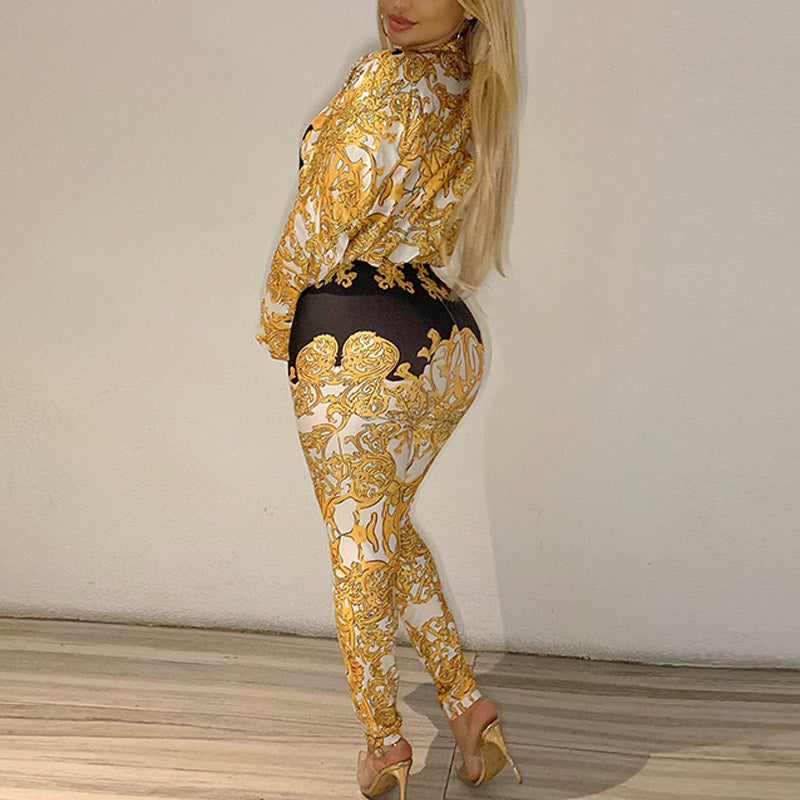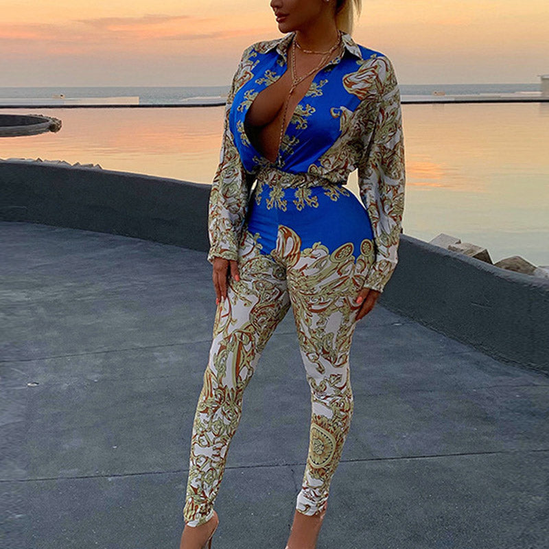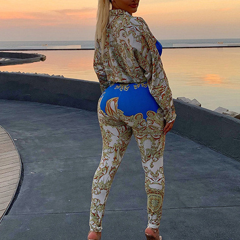 Fashion Floral Print Double Breasted Long Sleeve Shirt & Skinny Pants Set