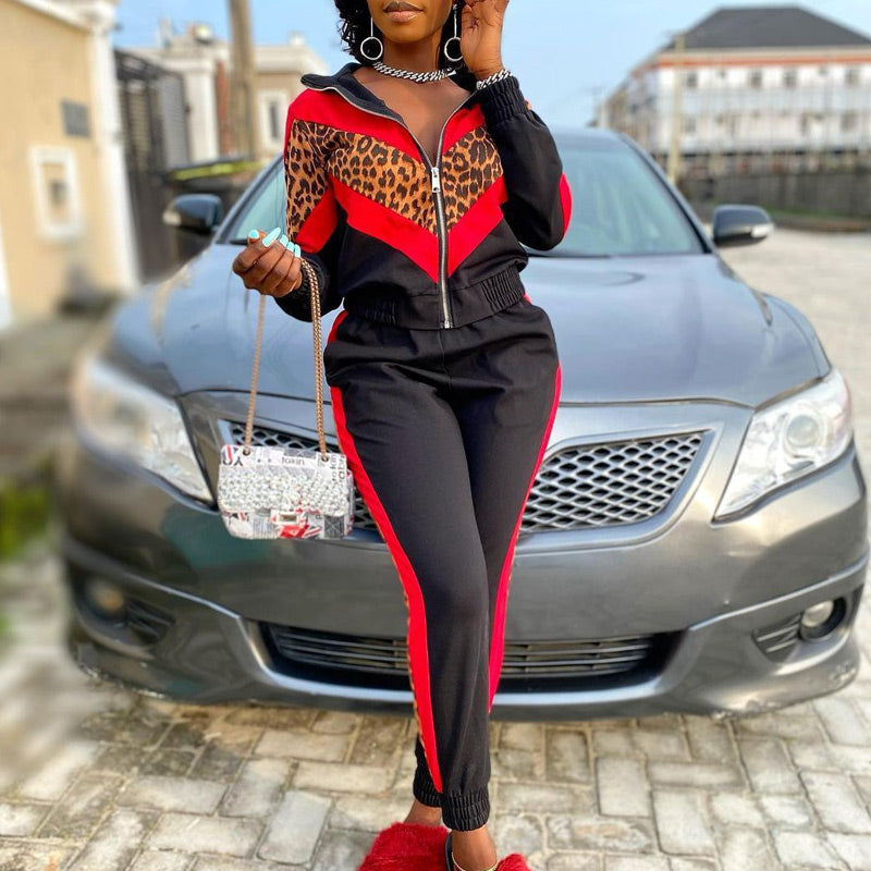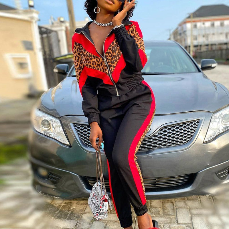 Leopard Print Patchwork Zipper Design Long Sleeve Pants Set