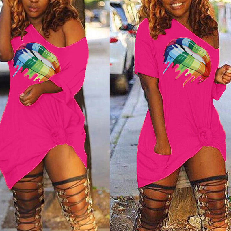 Lips Pattern One Shoulder Short Sleeve Loose Dress