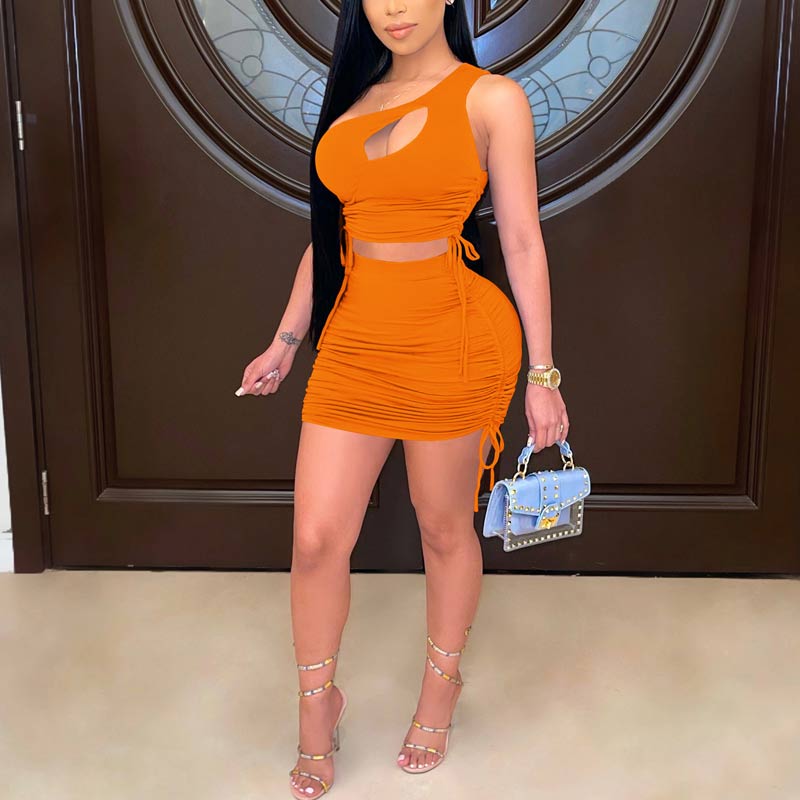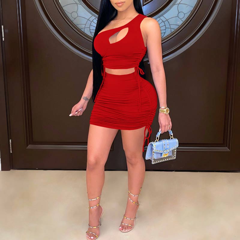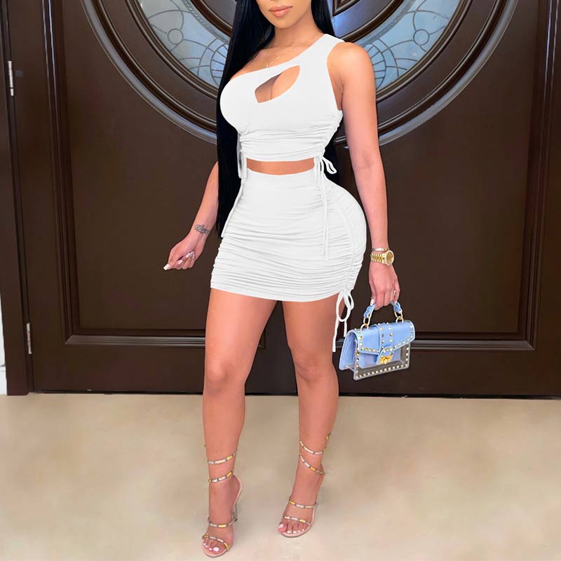 One Shoulder Pleated Bodycon Two Pieces Set