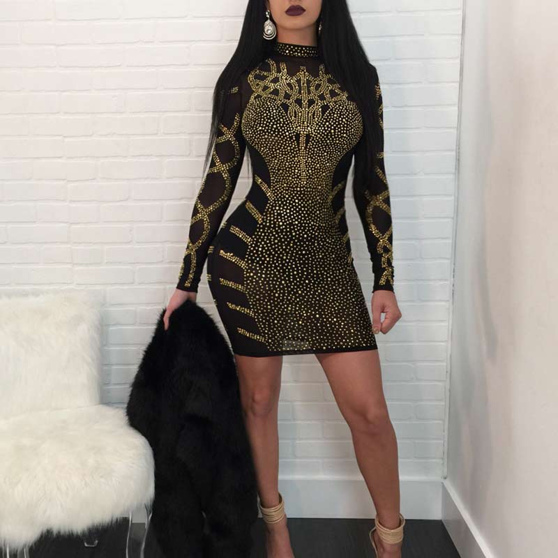Rhinestone Long Sleeve Zipper Design Bodycon Dress