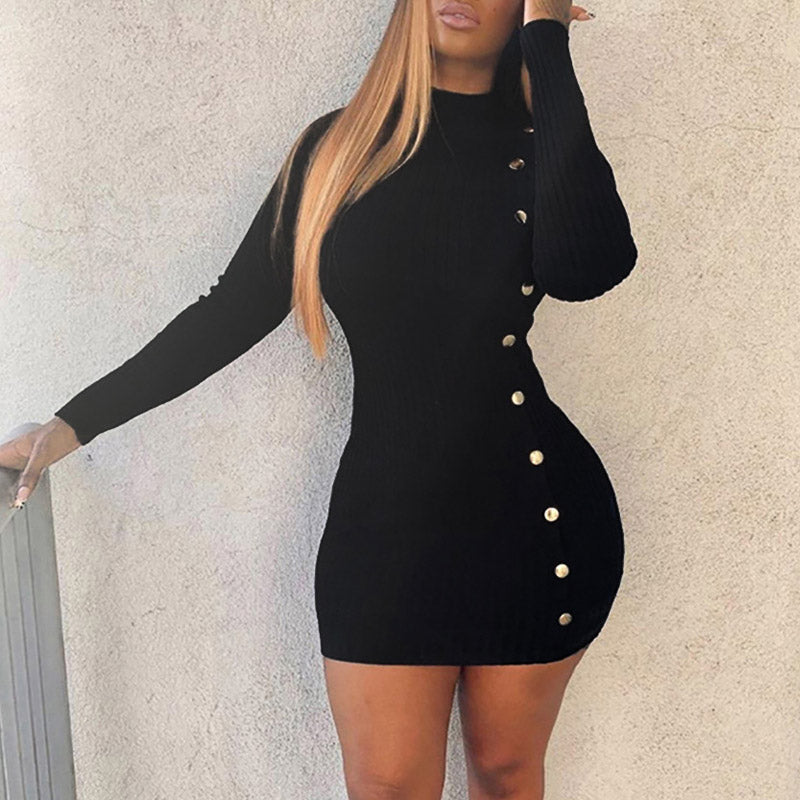 Solid Button Detailed Long Sleeve Bodycon Dress