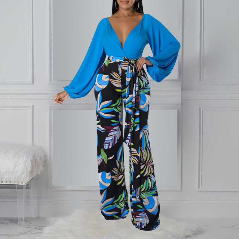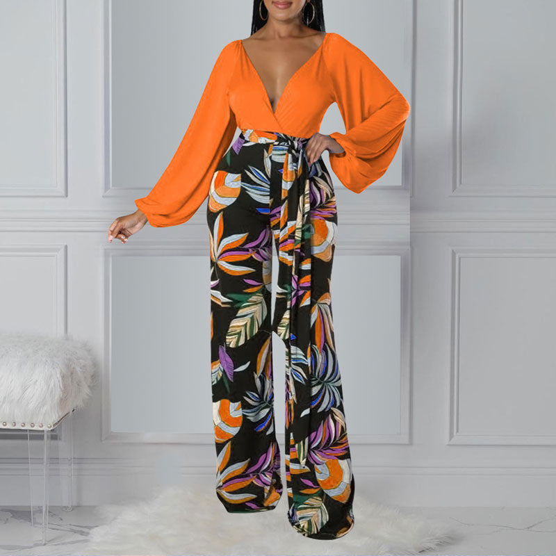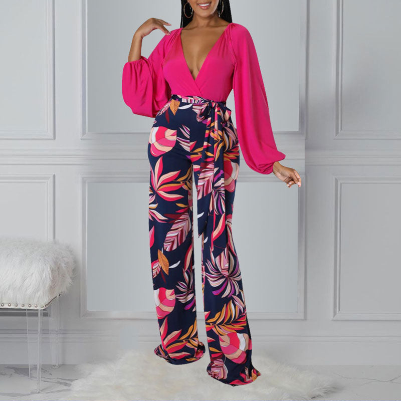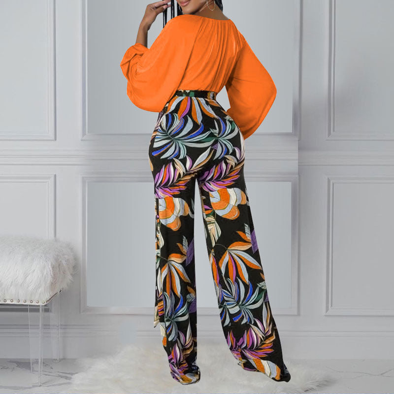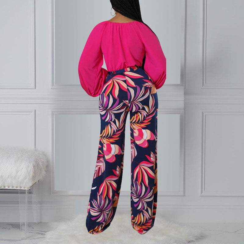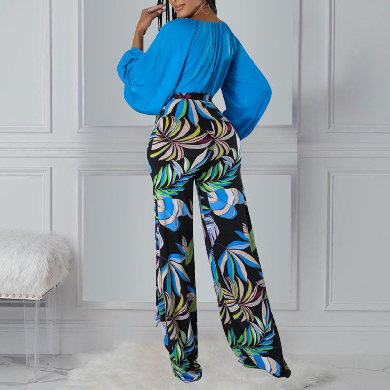 Solid Deep V-Neck Lantern Sleeve Top & Print Pants Set