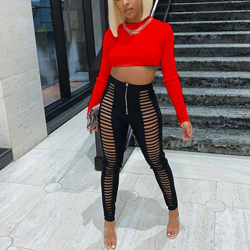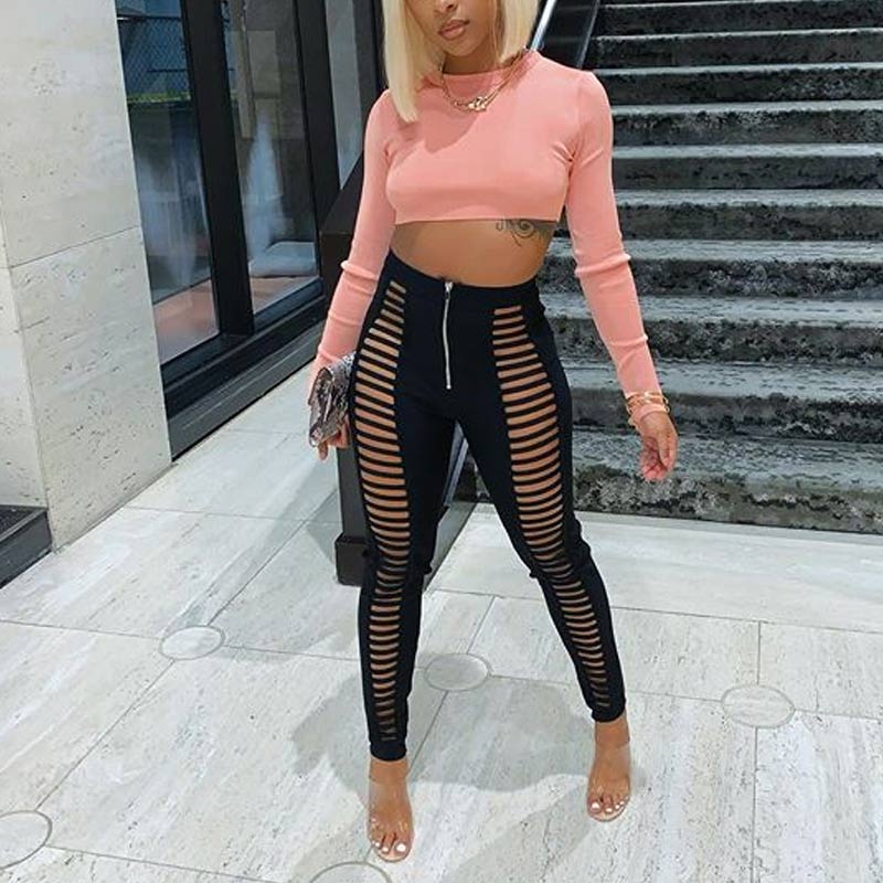 Solid Long Sleeve Crop Top & Cut Out Pants Set