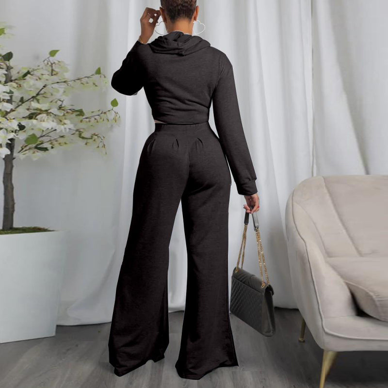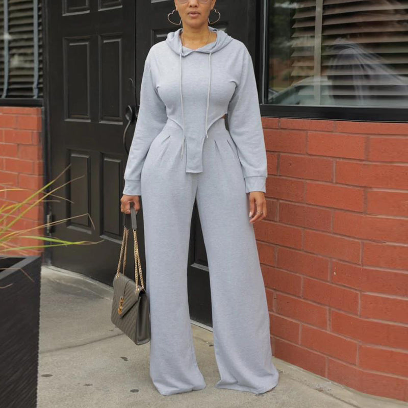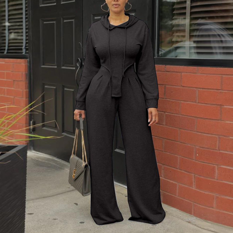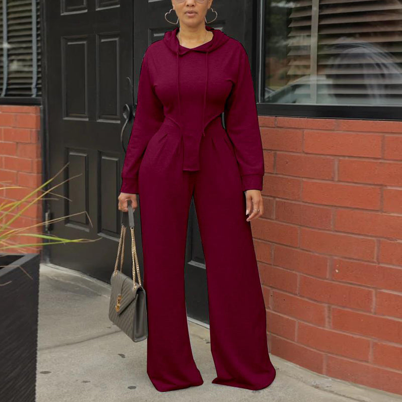 Solid Long Sleeve Irregular Hoodie Top & Wide Leg Pants Set