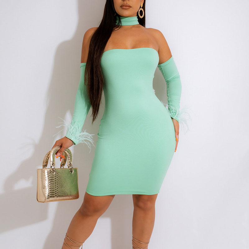 Solid Off Shoulder Long Sleeve Feather Design Bodycon Dress