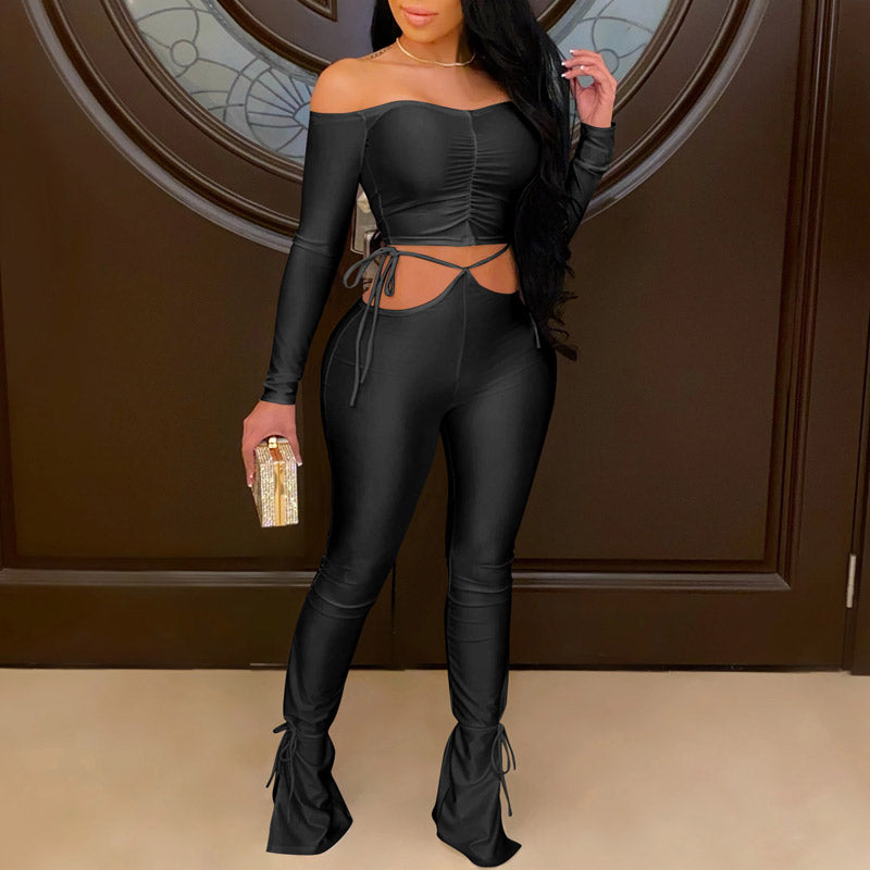 Solid Off Shoulder Long Sleeve Top & Stacket Pants Set