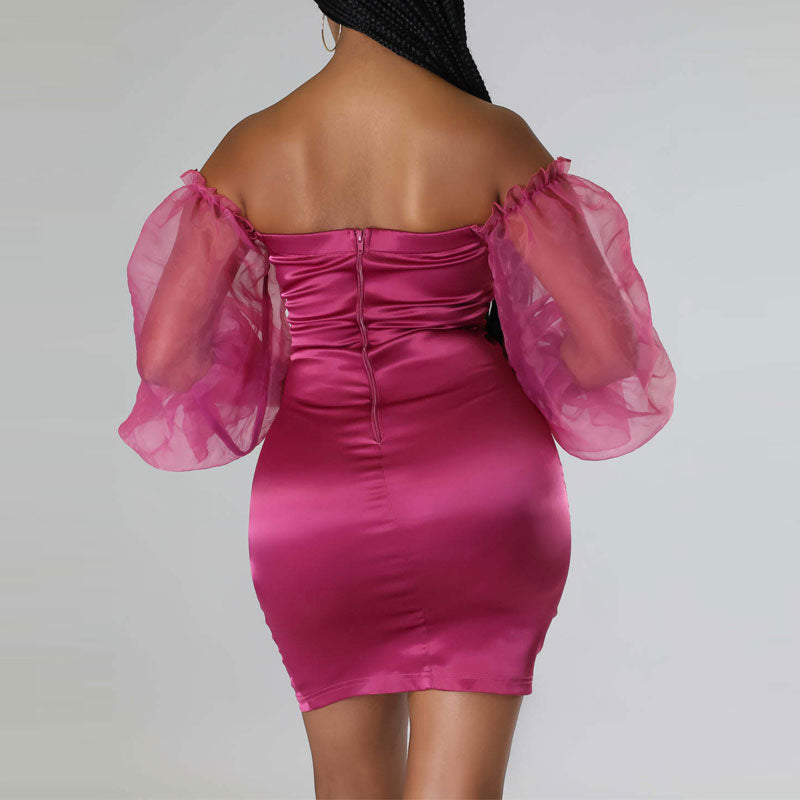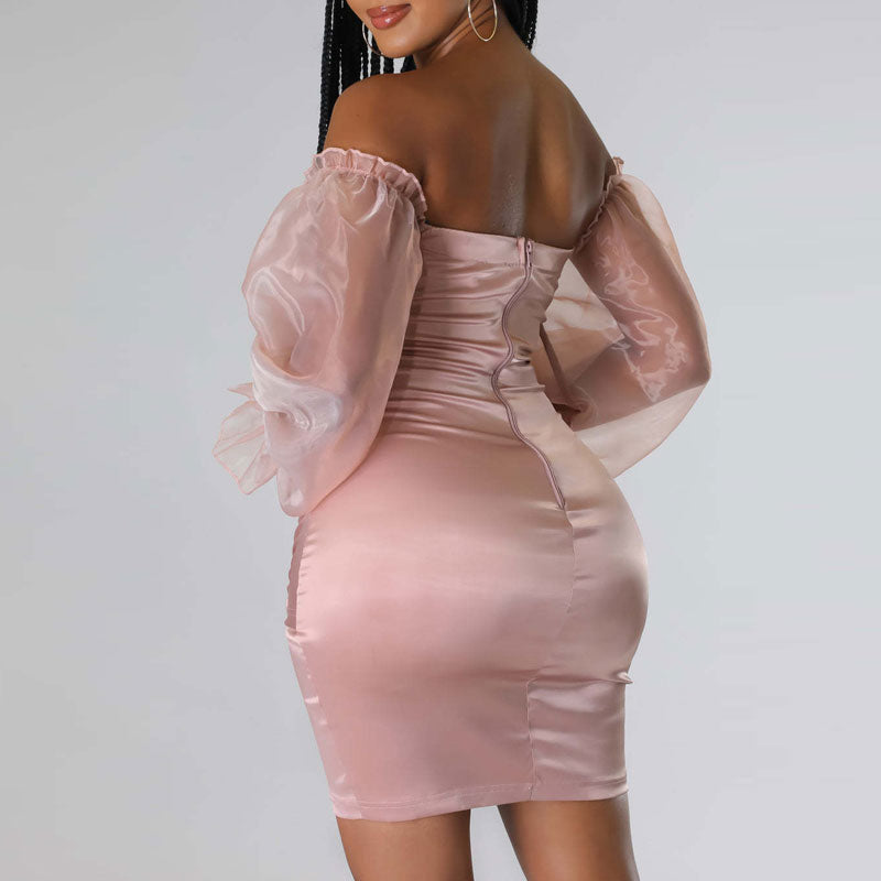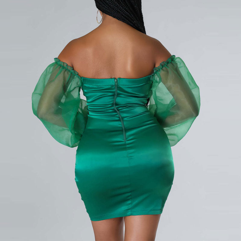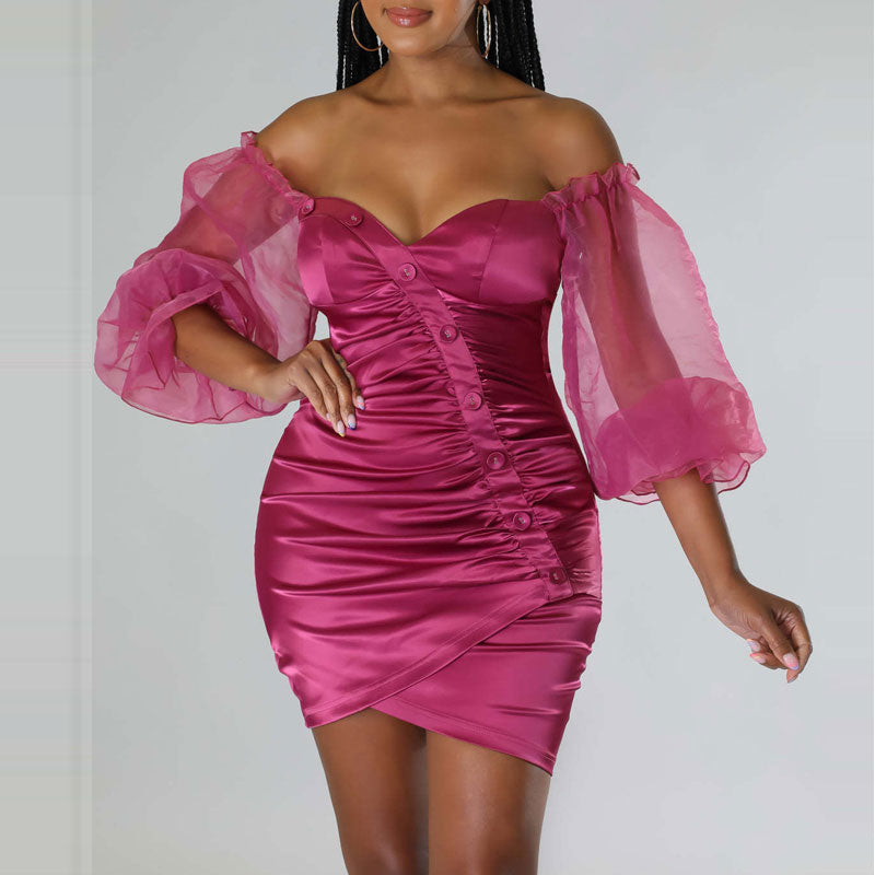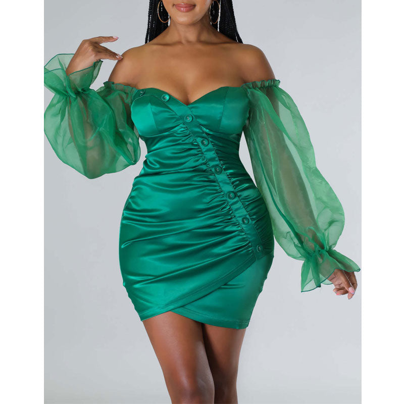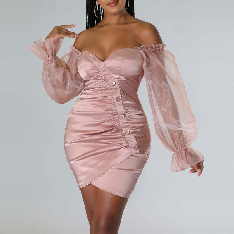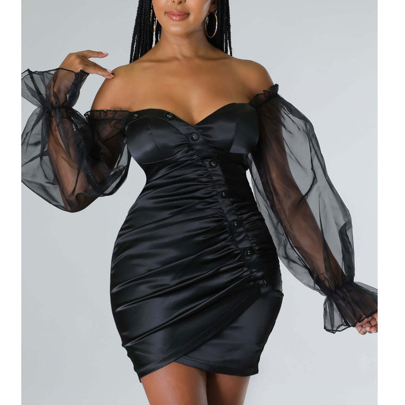 Solid Off Shoulder Mesh Sleeve Button Detailed Bodycon Dress
