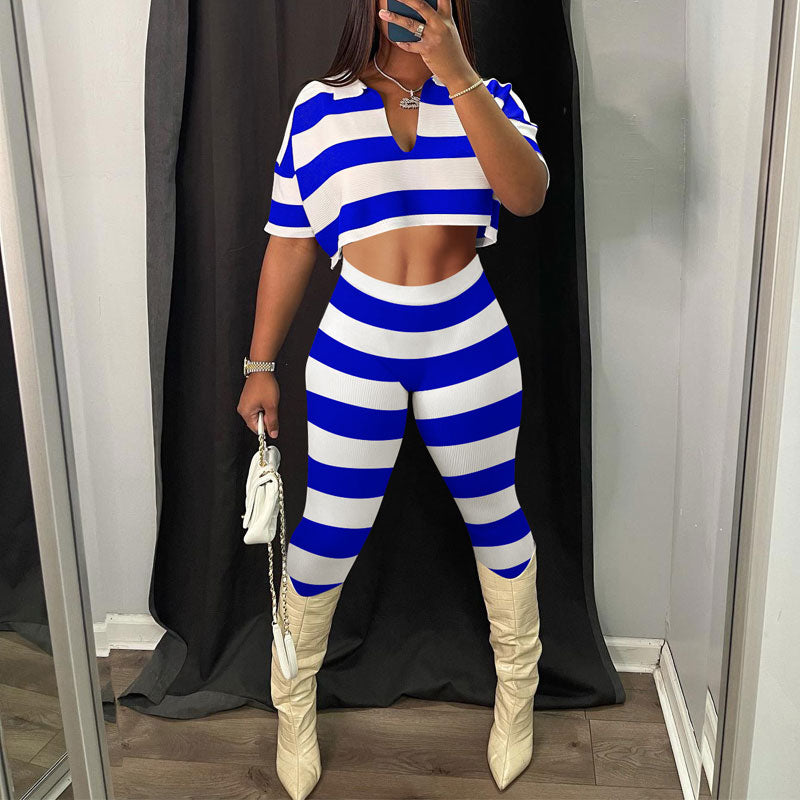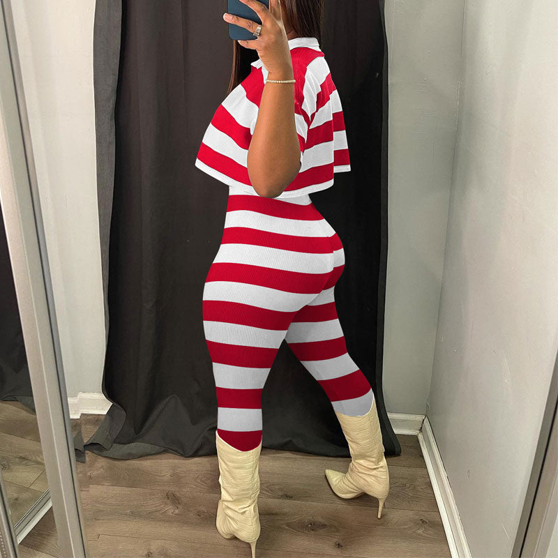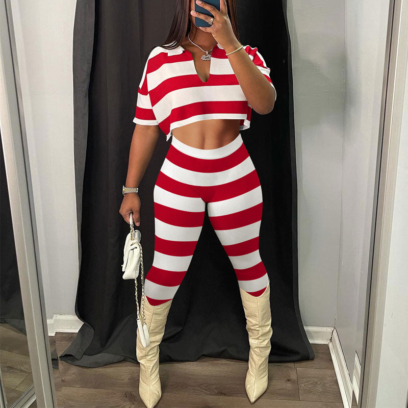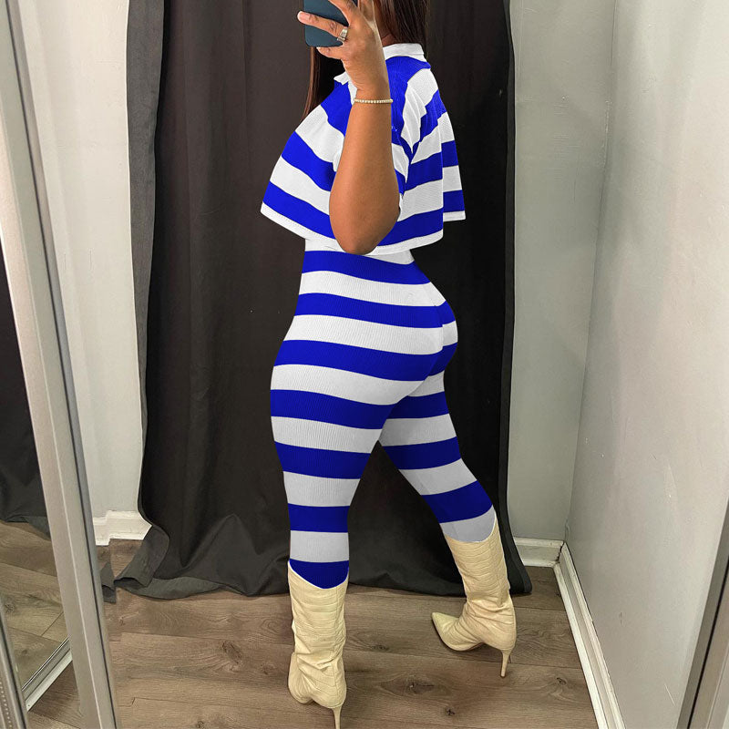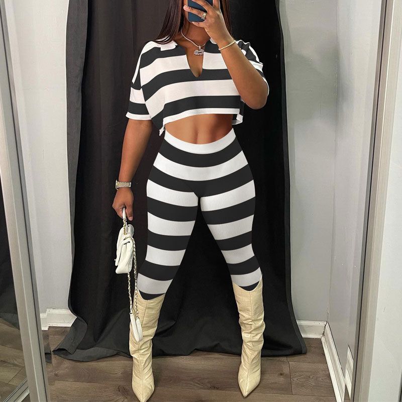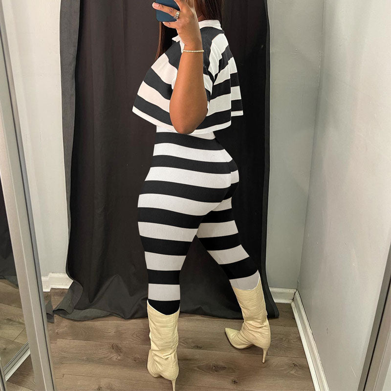 Striped Short Sleeve Rib-Knit Crop Top & Pants Set